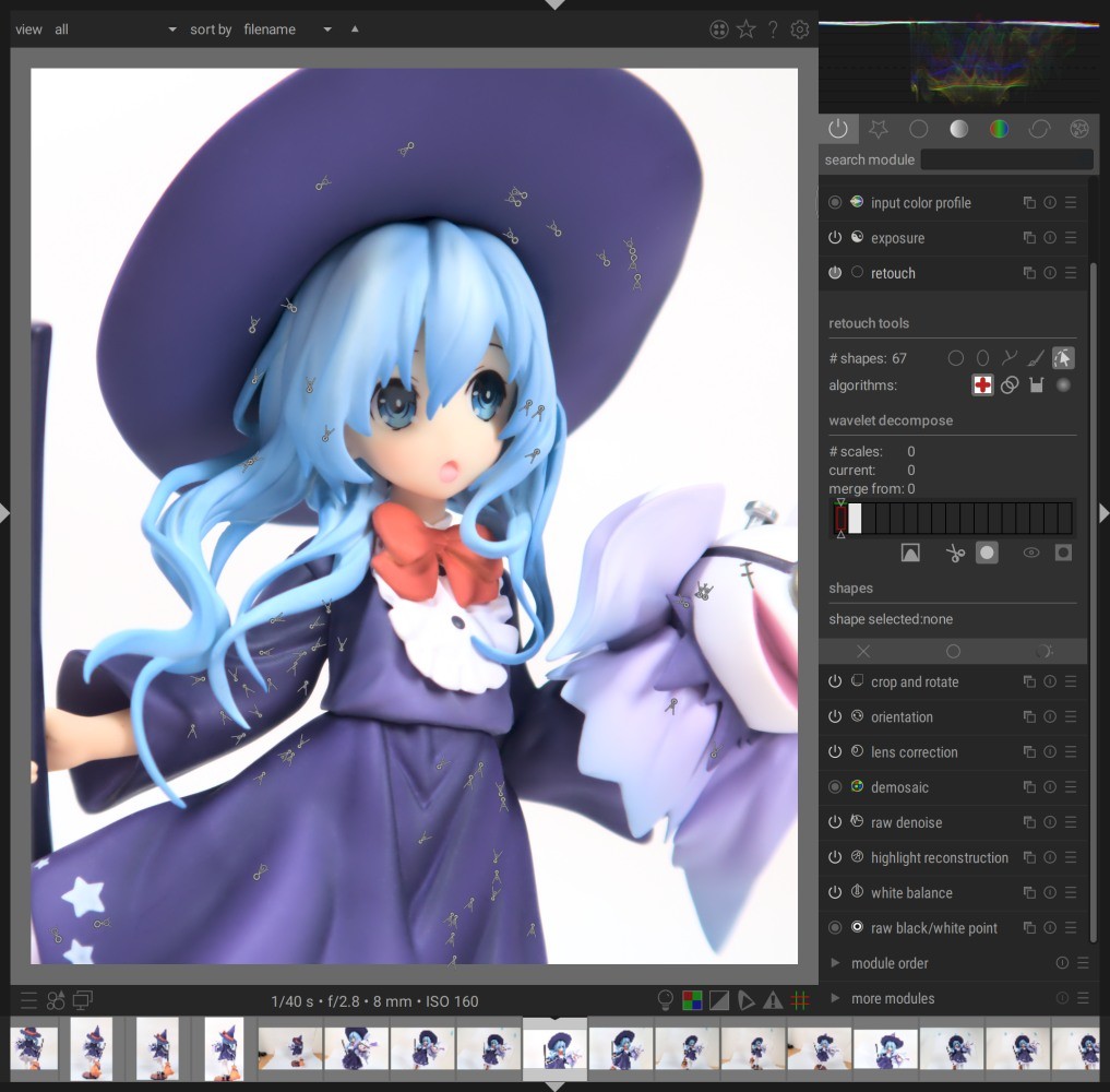 这次手办细节上感觉很稳,各个角度过去没有一眼就让人想开 retouch 模块开始划拉的地方,而且服装细节还原得非常棒。与之对比的是 之前的四糸乃,衣服的蓝色区域有很多并不是尘土的细小白点,虽然普通眼睛观察不怎么看不出来,但是到了照片里,就像平时看不到的尘土一样全都冒出来了,结果就是令人头秃的修图,毕竟都断过一次手了,这点不算什么。